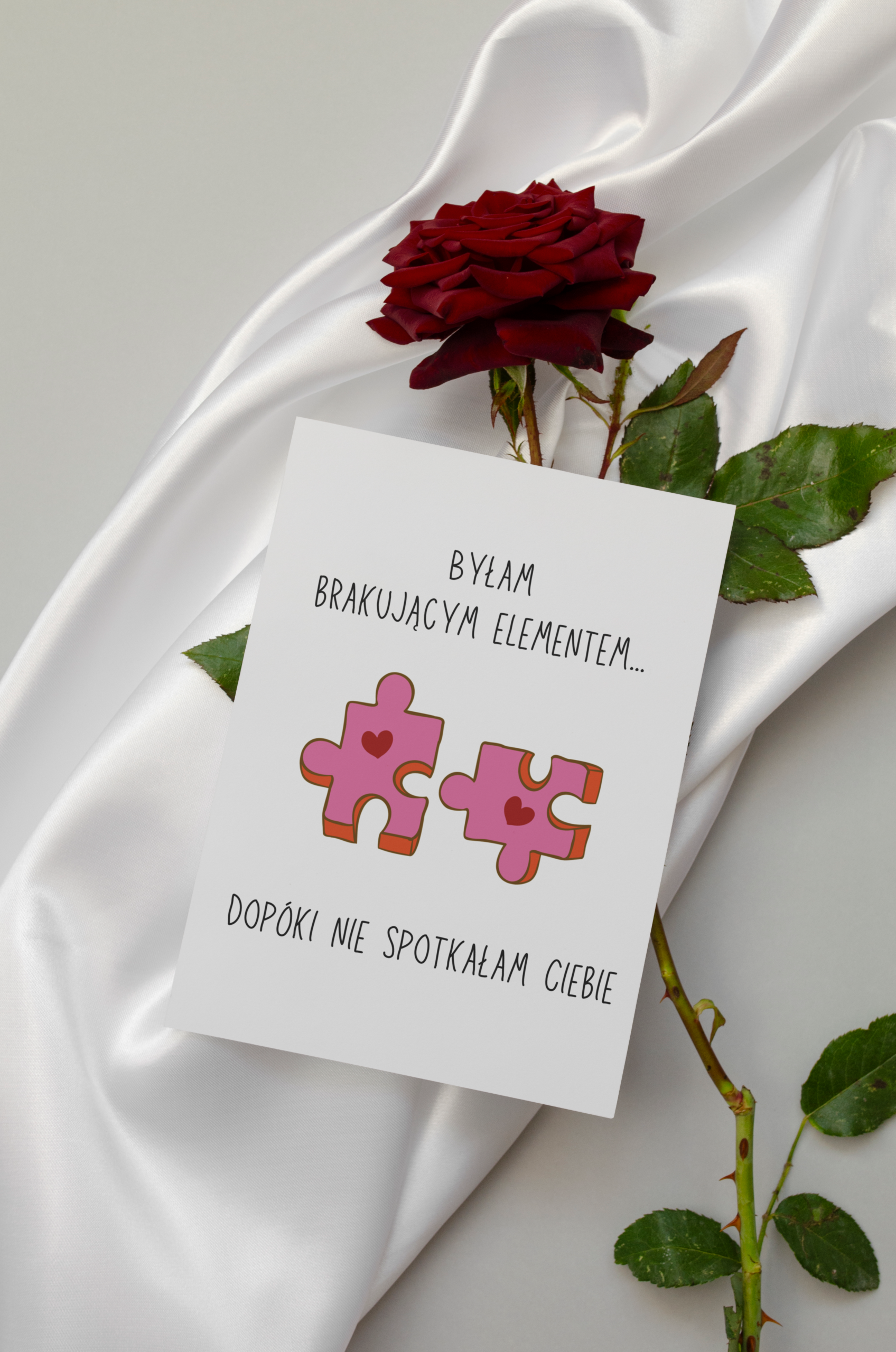 Urocza kartka okolicznościowa walentynkowa Byłam brakującym elementem, dopóki nie spotkałam Ciebie to wyjątkowy sposób, by wyrazić uczucia i podarować bliskiej osobie coś więcej niż tylko słowa. Subtelny, romantyczny design i starannie dobrana kolorystyka sprawiają, że już od pierwszego spojrzenia wywołuje uśmiech i ciepłe emocje.