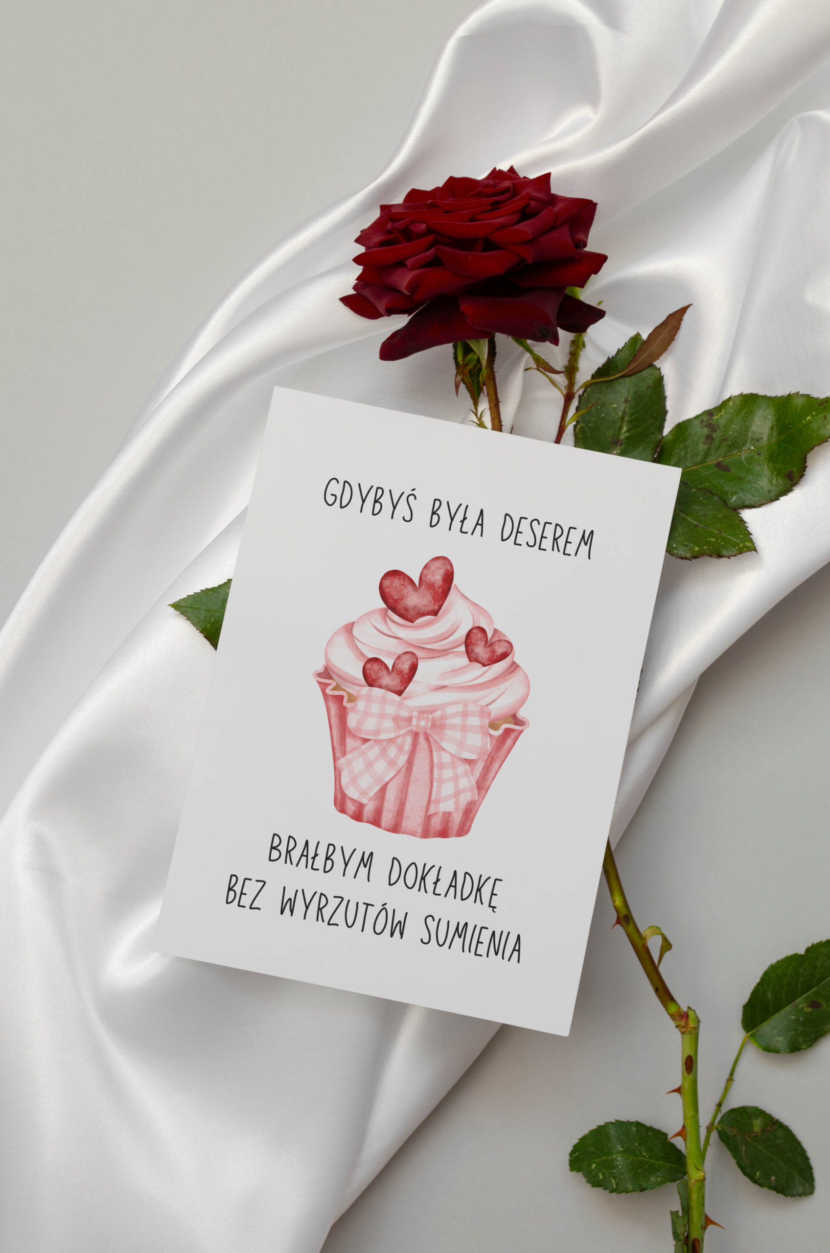 Urocza kartka okolicznościowa walentynkowa Gdybyś była deserem, brałbym dokładkę bez wyrzutów sumienia to wyjątkowy sposób, by wyrazić uczucia i podarować bliskiej osobie coś więcej niż tylko słowa. Subtelny, romantyczny design i starannie dobrana kolorystyka sprawiają, że już od pierwszego spojrzenia wywołuje uśmiech i ciepłe emocje.
