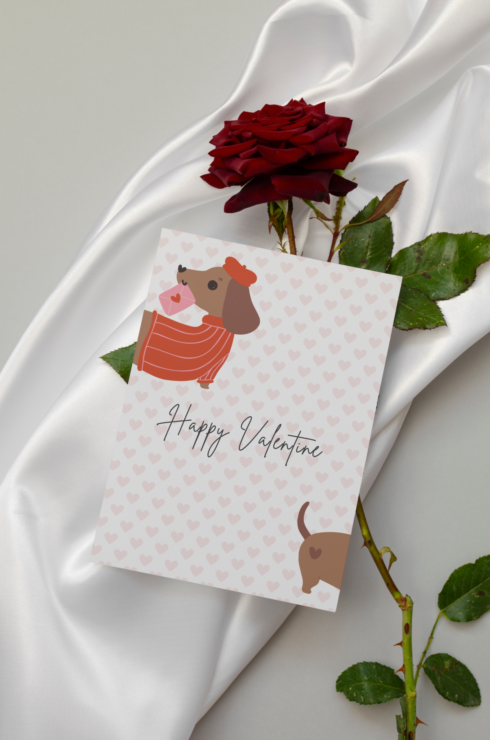 Urocza kartka okolicznościowa walentynkowa Happy Valentine Jamnik to wyjątkowy sposób, by wyrazić uczucia i podarować bliskiej osobie coś więcej niż tylko słowa. Subtelny, romantyczny design i starannie dobrana kolorystyka sprawiają, że już od pierwszego spojrzenia wywołuje uśmiech i ciepłe emocje.