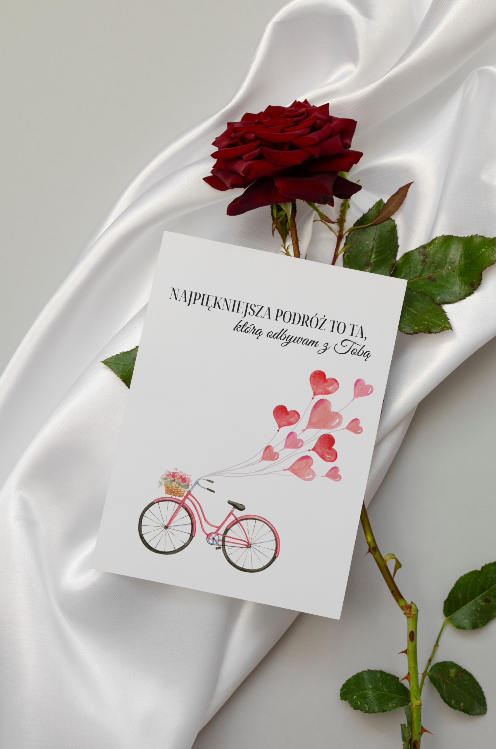 Urocza kartka okolicznościowa walentynkowa Najpiękniejsza podróż to ta, którą odbywam z Tobą to wyjątkowy sposób, by wyrazić uczucia i podarować bliskiej osobie coś więcej niż tylko słowa. Subtelny, romantyczny design i starannie dobrana kolorystyka sprawiają, że już od pierwszego spojrzenia wywołuje uśmiech i ciepłe emocje.