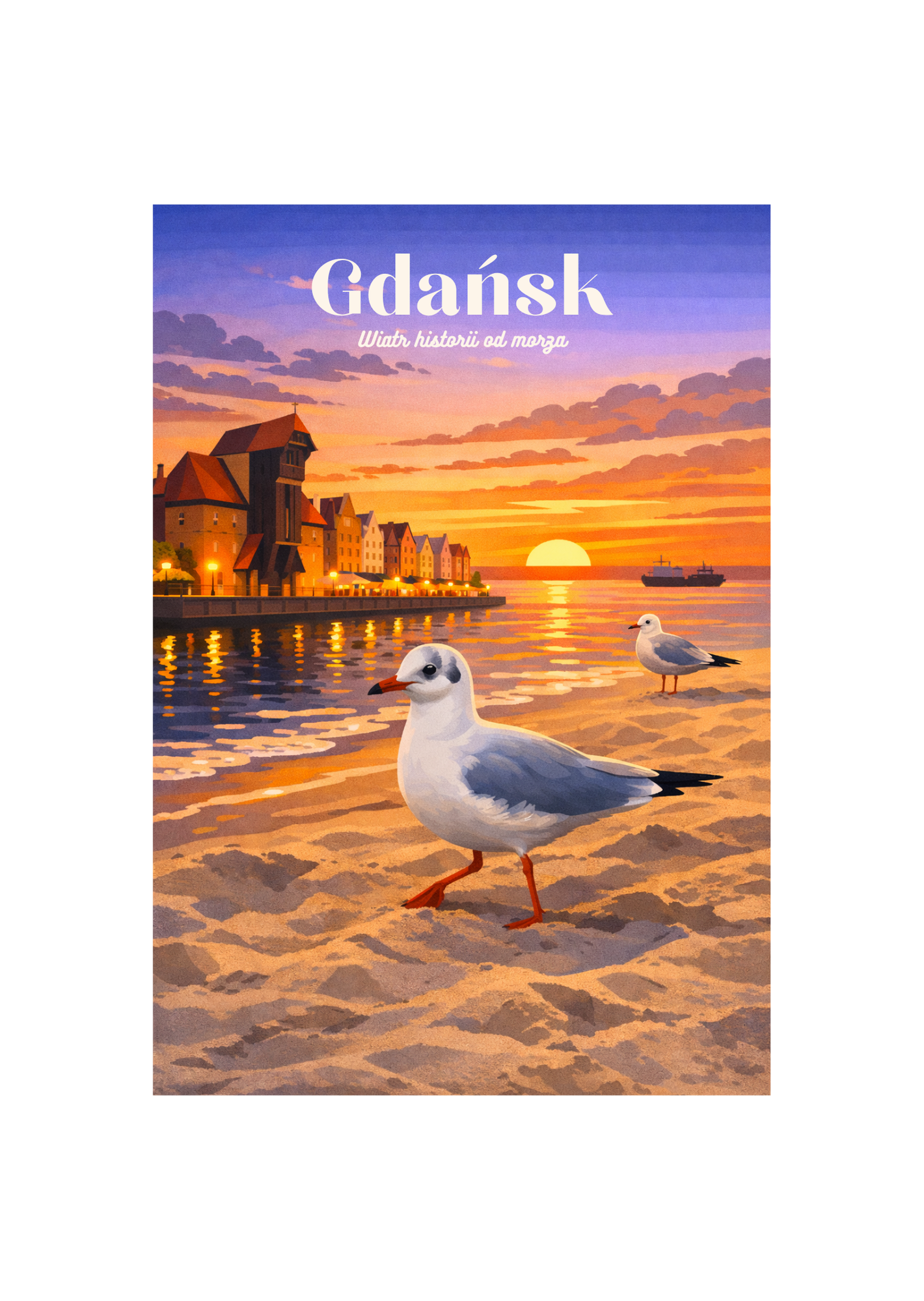 Pocztówka Gdańsk – Wiatr historii od morza to połączenie nadmorskiego klimatu z bogatą historią miasta. Nastrojowy design i poetyckie hasło tworzą wyjątkową pamiątkę, która oddaje ducha Gdańska.